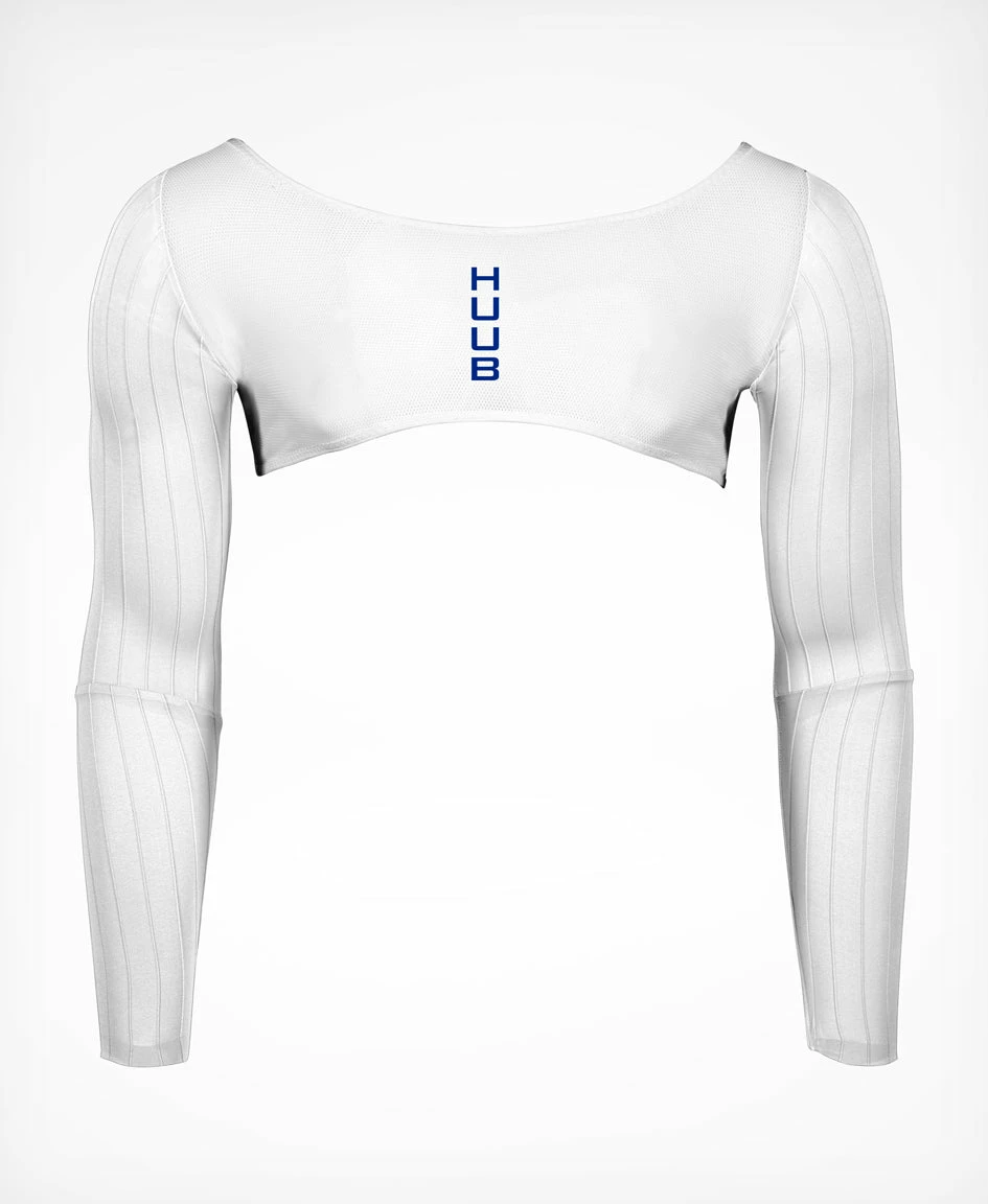 The original Aero-Bridge Undervest. Developed at the Silverstone Sports Engineering Hub and Derby Velodrome alongside the World’s greatest engineers and riders.A dynamic Undervest designed to be worn with any smooth sleeve Aero Speed Suit. The baselayer lit up the Olympic Games and caused nations to stop and ask why they hadn’t thought of it. It is so effective everybody wants it! This is the product that caused certain cycling team leaders to totally flip their lid… In fact, we really should have called it the FTL undervest. But the fastest secret is now commercially available and at a price not just for rich cycling nations.Developed to create a unique surface reaction disrupting the body’s boundary layer, the Aero-Bridge Undervest delivers the most effective solution to significant speed gains. Utilising HUUB’s patented ‘Aero-Bridge’ technology, it is another HUUB first that is available to all athletes to help release their potential on the road or track.The base layer creates dynamic surface reactions to trip the boundary layer of air flowing over the cylinders of the body (biceps & forearms). The result is significant aerodynamic savings, even greater than traditional textured fabrics. The Aero-Bridge technology works by stretching smooth fabric over ribbed fabric (raised ridges form a suspension of material like a suspension bridge) to disrupt the airflow by the ridge and then further alter it by the suspended fabric, causing minuscule air particles to enhance displacement of the boundary layer. Different ridges can be utilised for different speeds. Featuring our new exclusive ‘Aero-Bridge’ technology, ridged fabric in differing spaces, dependent on your speed, is worn beneath the speed suit. The marriage allows the undervest to deliver the secret that’s been helping nations, individuals and record holders attain their very best. Lightweight Italian fabrics. Breathable body fabrics. Full arm coverage. Tried, tested and medal-delivered technology. Exhaustingly tested in the wind tunnel. For speeds of 45-55kph The Aero-Bridge Undervest works with smooth skin suits. We recommend the Aero Skin Suit with our patented (EP3213911B1) Aero-Bridge Undervest.