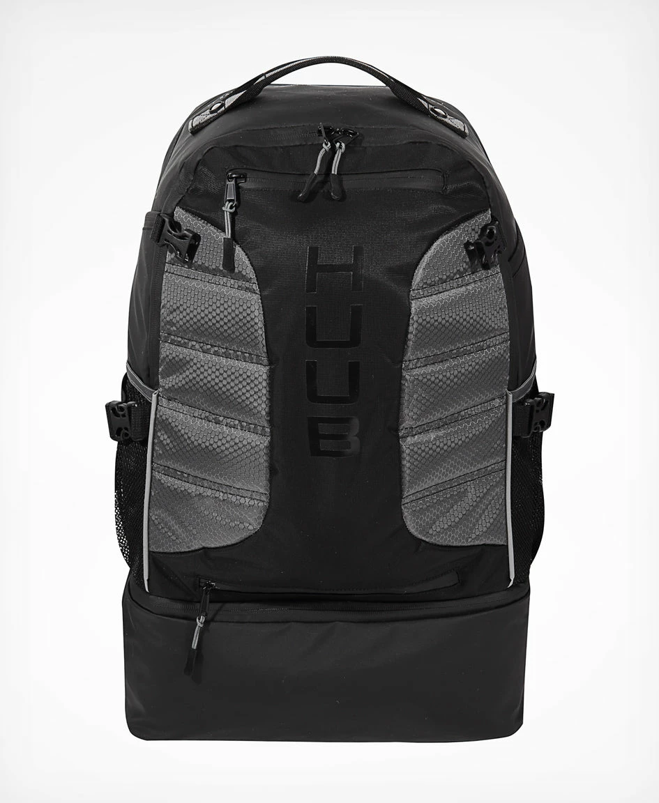 A place for everything and everything in its place with our Transition Three (TT) Bag. The premium Transition Three Bag from HUUB has a pocket for everything, whether its race day or a training day, at the pool or the track, the huge 40 litre capacity of the TT bag can handle it. It comes with a hidden mesh helmet cradle, which can be zipped away when not in use, meaning your helmet will be in safe hands no matter where you go. With wet and dry compartments, you can be sure your dry gear will always be good to go with the wet gear stored safely in the waterproof compartment at the bottom of the bag. The side expandable pockets are perfect for drinks bottles. There is also a handy front zipped pocket for easy, quick access, ideal for your electronics, keys, phone etc. The padded adjustable shoulder straps ensure optimum comfort. The chest strap helps to distribute weight when riding, running or just during the daily commute. The ultimate backpack for race day, travelling, training or commuting. A huge 40-litre volume to store all of your triathlon gear. Zip away helmet cradle. Handy top carry handle. Waterproof storage for your wetsuit, towel or swimwear. Storage compartments for shoes and helmets. Multiple pockets for storing tools, cards and other essentials. Padded adjustable straps for improved active comfort. Large entry for ease of kit location. Reflective trim for night/morning riding. Inner mesh sleeve for laptops. Rear mesh pocket. Multiple inner pockets. The dimensions of the rucksack are approx. 60cm high x 34cm wide x 20cm deep.